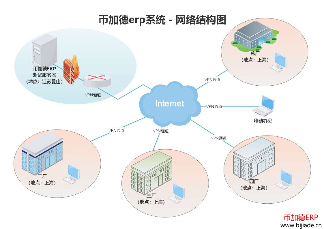 上面的網(wǎng)絡架構(gòu)圖是幣加德ERP在因特網(wǎng)環(huán)境下的典型應用,這家客戶在上海有4家工廠,位于不同的地點,在系統(tǒng)測試階段,使用位于江蘇昆山的幣加德ERP測試服務器,通過VPN把這些不同地方的節(jié)點聯(lián)系到一起,就像在局域網(wǎng)內(nèi)一樣,實現(xiàn)協(xié)同辦公。VPN隧道技術保障了企業(yè)業(yè)務數(shù)據(jù)傳輸?shù)陌踩苊獍压緲I(yè)務數(shù)據(jù)直接暴露在互聯(lián)網(wǎng)環(huán)境下,從而降低被黑客攻擊的風險。
