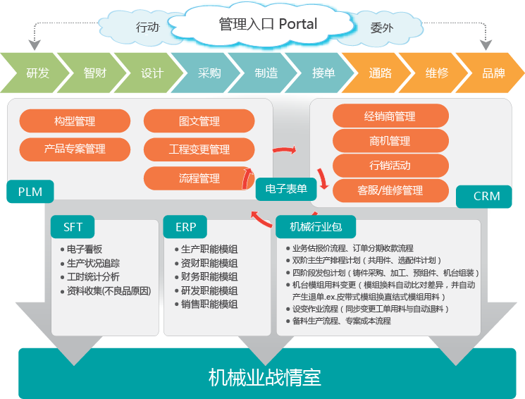 機械業目前的生產模式正從小批量多品種向「大量訂制」在轉變,挑戰所帶來的沖擊已深入各職能部門,讓整個組織都處于快速變化中。而響應來自客戶需求的變動所引發的研發設計的變動、采購發包的變動、委外工單的變動、生產制造的變更等,再加上日趨頻繁,這一連串的變動如何使之聯動起來,將是機械業面對市場需求無可避免的巨大挑戰。