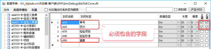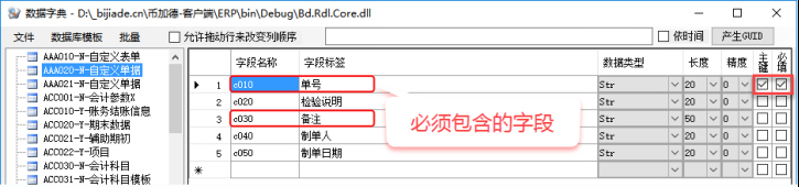 ①建表。打開【系統設置】/【數據字典】,按圖28-3進行操作(注意主鍵)。數據表命名規則:3字母(表示子系統) + 3數字(流水),例如:ACC030。數據字段命名規則:小寫字母 c + 3數字,例如:c010、c020、……。最后點【文件】/【保存】。