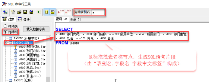 打開(kāi)【系統(tǒng)設(shè)置】/【SQL命令行工具】,可以使用此工具自動(dòng)生成SQL語(yǔ)句,如圖29-1。最后點(diǎn)工具欄上的綠色三角形按鈕