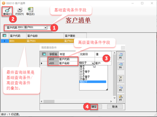 高級(jí)查詢條件:當(dāng)點(diǎn)【查詢】時(shí)打開(kāi)“高級(jí)查詢條件”窗口,除了支持等值查詢外,還支持其他查詢操作符,比如:大于、大于等于、小于、小于等于、不等于、相似于。