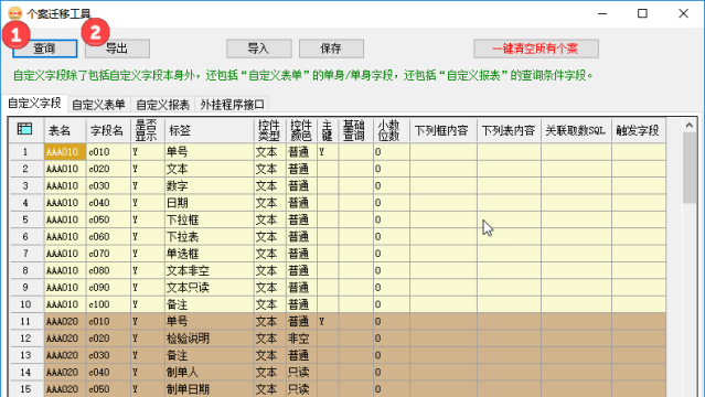 打開個案遷移工具,默認頁簽為“自定義字段”,點【查詢】,再點【導出】,導出的“自定義字段.xml”默認會保存在ERP根目錄下的“個案遷移”子目錄下,如圖31-2。