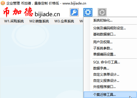 每當新建賬套時,如果自定義字段、自定義表單、自定義報表、外掛程序接口,這些都要重新設置一遍,挺費事的,個案遷移工具就是為了解決此問題,可以把舊賬套的這些設置導出來,再導入到新的賬套。“個案遷移工具”在“系統設置”菜單下,如圖31-1。