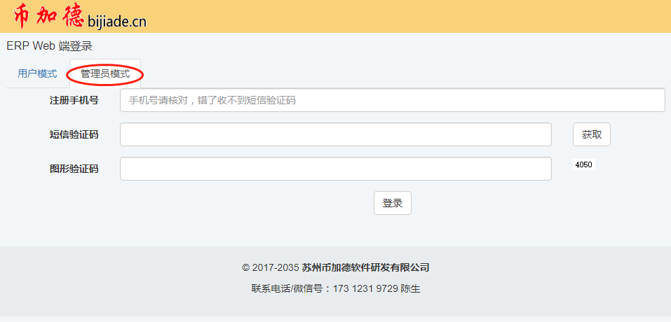 在打開的 ERP Web 端登錄頁面,切換到“管理員模式”,輸入注冊手機號后點【獲取】,得到短信驗證碼,并輸入圖形驗證碼,然后點【登錄】,如下圖。
