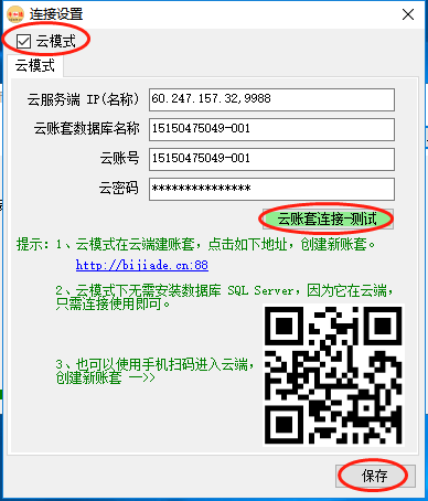 點【云模式】,輸入云服務端的相關信息后,點【云賬套連接-測試】會彈出連接成功的提示,最后點【保存】回到登錄界面,如下圖。